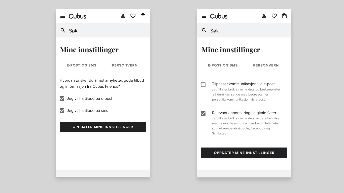 Her kan kundene velge hvordan de ønsker å motta kundekomunikasjon fra butikkene.